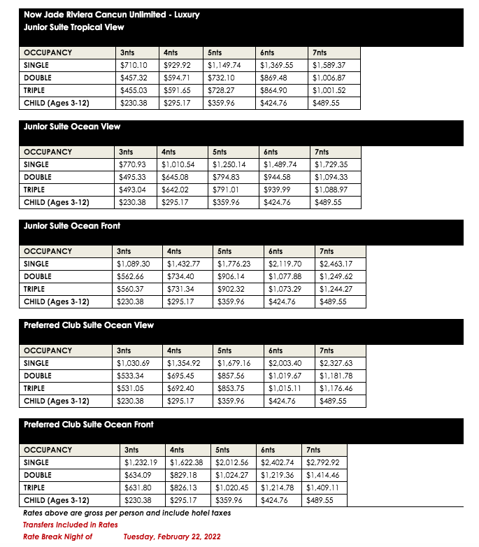 ROOM RATES FOR NOW JADE RIVIERA CANCUN